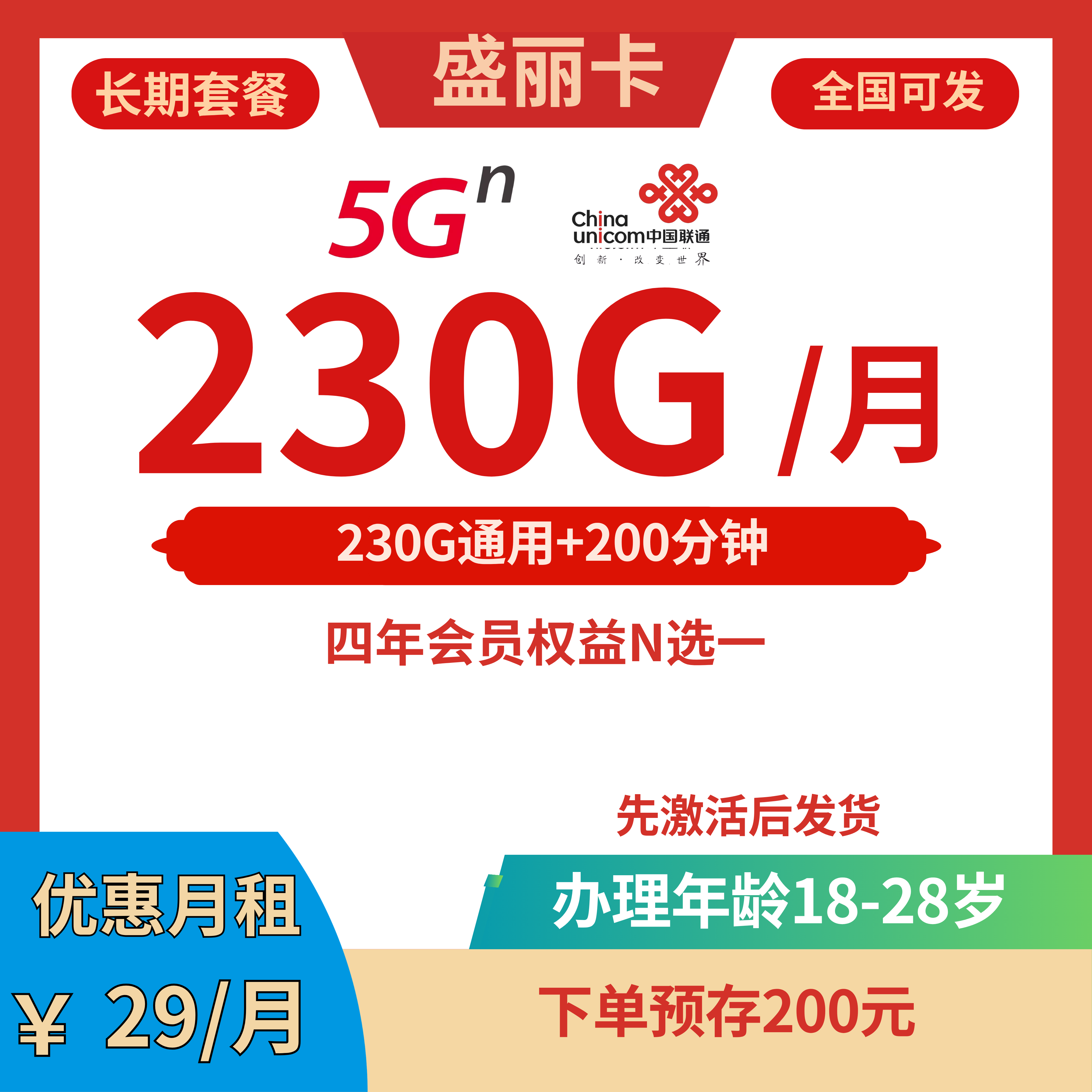 联通盛丽卡29元230G通用+200分钟+会员N选1【发全国】